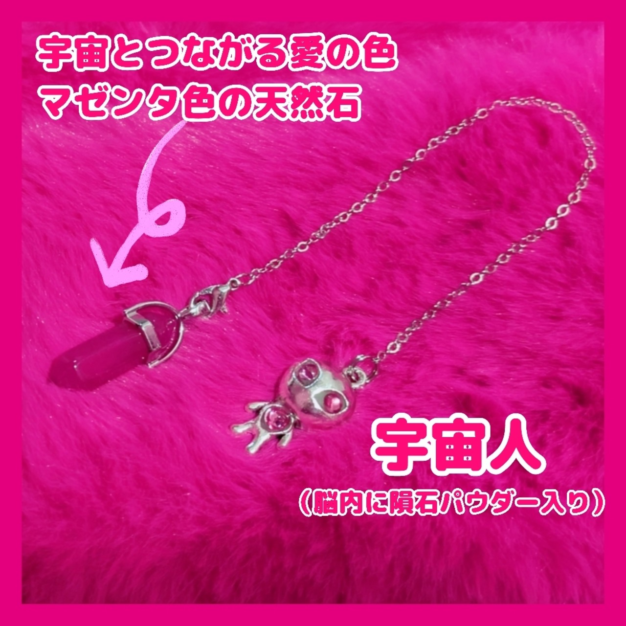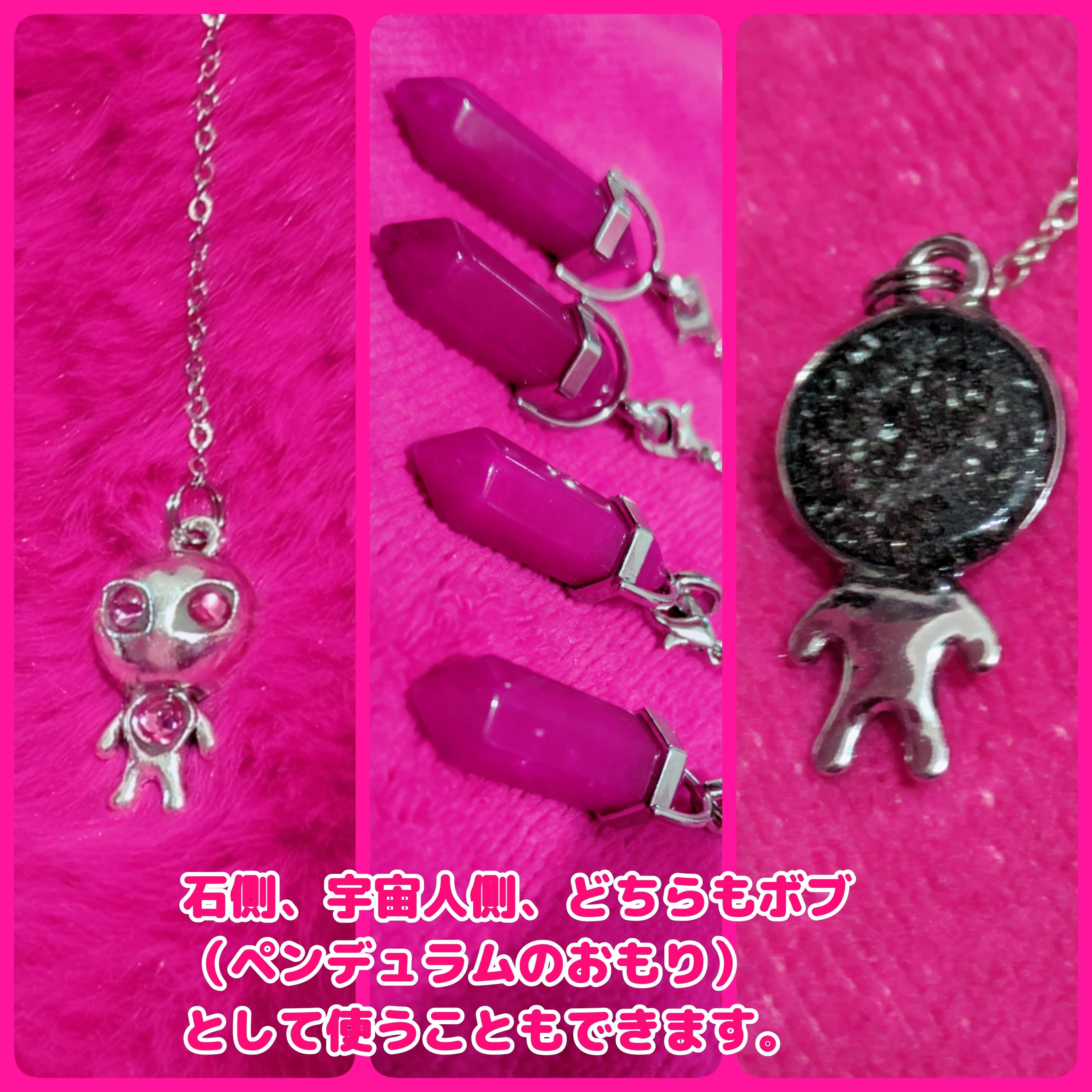 ボブ(おもり)部分は、第8チャクラと対応し、「宇宙とつながる神聖な愛の色」マゼンタ色の天然石。